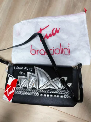 Bolso de mano y bandolera de la marca Tua Braccialini, que pertenece a la línea más vanguardista y original de Braccialini. El diseño es parte de su colección temática "Cartoline" o "Temi", conocida por presentar edificios icónicos y lugares famosos. Marca: Tua Braccialini (Braccialini Firenze). Presenta un aplique detallado en 3D que representa la icónica Ópera de Sídney en color plateado. De color negro, con acabado brillante y opaco de charol y material sintético de alta calidad. Medidas 19x35 cm...correa de quita y pon de 1,30 cm. En su interior bolsillo con cremallera y dos abiertos. Nuevo a estrenar, bolsa guardapolvo