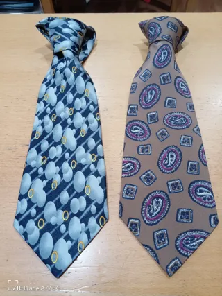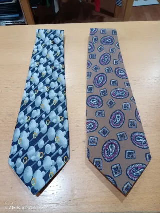 Conjunto de dos corbatas sin estrenar. Ideales para complementar tu atuendo. Lote de 2 corbatas, nuevas a estrenar con etiqueta. Calidad superior!!! Te encantarán y le encantarán!!! - Diseño con círculos y líneas diagonales en tonos azules. - Estampado de cachemir y cuadros en tonos marrones.