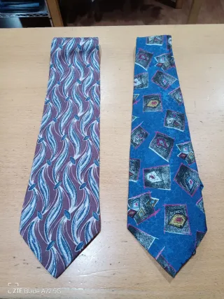 Conjunto de dos corbatas a estrenar con diseños únicos. Lote de 2 corbatas, nuevas a estrenar con etiqueta. Calidad superior!!! Te encantarán y le encantarán!!! - Una corbata morada con estampado de hojas en tonos azules y blancos. - Una corbata azul con un patrón geométrico de cuadrados y rombos en varios colores.