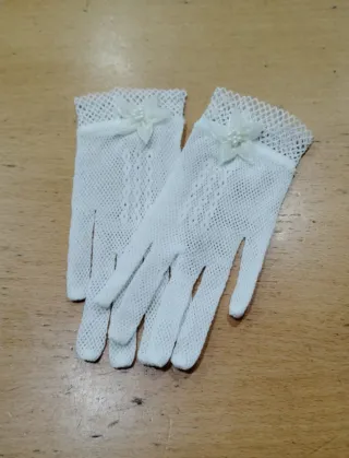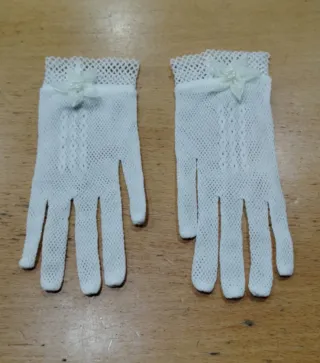 Preciosos guantes de comunión para niña, nuevos a estrenar. - Tejido de malla fina. - Longitud hasta la muñeca. Bonitos guantes de comunión de niña. En blanco roto y dibujo de red, con un bonito lazo central de raso. Nuevos a estrenar. Le maravillarán!!