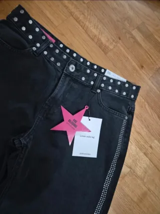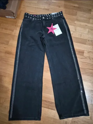 Vaqueros negros de corte ancho con detalles brillantes. Edicion limitada Colaboracion de one dilemma con stradivarius Tengo una 36 y una 34 - Cintura adornada con tachuelas plateadas. - Raya lateral con pedrería. - Cierre de cremallera y botón.