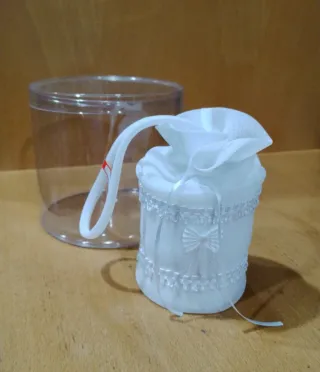 Bolso tipo limosnera, ideal para complementar su atuendo. - Diseño elegante con detalles de encaje y lazo. - Cierre fruncido superior. - Incluye asa para llevarlo cómodamente. - Se entrega con su etiqueta original. Un bonito bolso limosnera, tipo bombonera para niña. Con pasamanería central y cierre de cordón ajustable. Nuevo con etiqueta y caja Una maravilla para su gran día!!