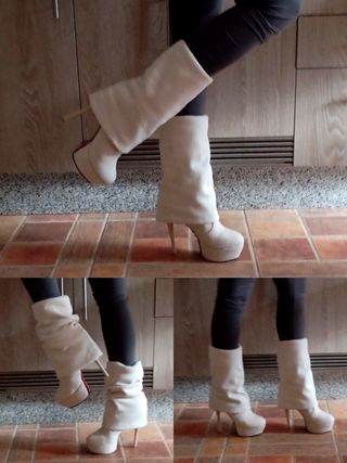 Botas color marfil / hueso, de antelina Multi-posiciones! Lo que las hace tan especiales es que se pueden poner de múltiples posiciones. Se pueden llevar como botas altas por encima de la rodilla, por debajo de la rodilla, de media caña, por la pantorrilla, estilo botín Dobladas, arrugadas, estiradas, con pliegues... ❗Puse múltiples fotos para que se vean puestas. Son muy blandas y ligeras! Además son muy cómodas ya que la plataforma está muy bien proporcionada con el tacón y tanto la espalda como los pies van descansados. MEDIDAS Tacón 13 cm. Plataforma 4 cm. (Como ir en un tacón de 9 cm.) Talla 38 (talla bien) ❗NO NEGOCIABLE.