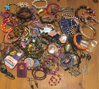 Lote de múltiples piezas de bisutería: pulseras, pendientes, pins, abalorios, cuentas y colgantes. Más de 50 unidades variadas. Materiales: metal, plástico, cristal, madera y otros. Ideal para manualidades, decoración o como un detalle para tu conjunto perfecto. Vienen en una caja de cartón, se vende todo junto como un lote. Venta en persona en el centro de Madrid. Si tienes dudas sobre el contenido del pack, escríbeme :)