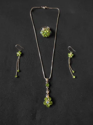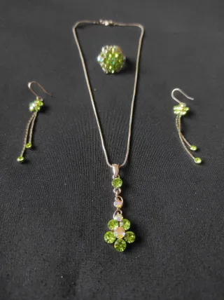 Conjunto de bisutería con un diseño floral. - Incluye un colgante. La cadena está oscurecida pero el colgante se puede cambiar sin problema a una nueva. - Dos pendientes a juego. - Un anillo ajustable. - Detalles en pedrería verde y abalorios.