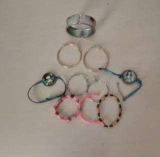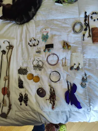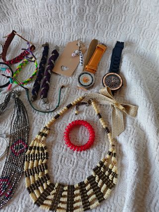 Este lote de bisutería incluye una variada colección de 10 collares, 24 pulseras o pulseras tobilleras, 4 anillos, un lazo dorado, 2 relojes ( están sin pila, no sé si funcionan), y un llavero. Todo con diseños únicos que combinan materiales como cuentas, hilos, metal y abalorios. Sus estilos van desde lo elegante hasta lo bohemio e informal, ofreciendo opciones versátiles para cualquier ocasión. Ideal para quienes buscan accesorios originales y coloridos para complementar su look con un toque artesanal y moderno. Cada pieza aporta un detalle especial, permitiendo combinaciones creativas y personalizadas. Todo por 8,50€.