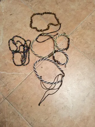Conjunto de bisutería variada con diferentes estilos y diseños. - Piezas individuales a 2 euros cada una. - Incluye collares, pulseras y otros accesorios. - Diseños con abalorios, conchas y detalles metálicos.