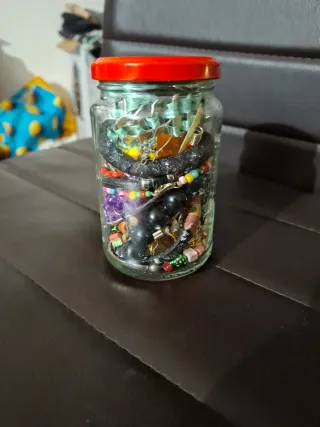 Tarro de cristal lleno de bisutería y abalorios. - Cierre metálico con etiqueta. - Variedad de pulseras y collares. - Cuentas de diferentes tamaños y materiales.