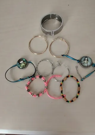 Lote de accesorios de bisutería. - Pulsera con detalle de personaje. - Pulsera de hilo rosa con abalorios. - Pulsera de cuentas de madera y colores. - Pendientes de aro dorados. - Pendientes de aro plateados. - Brazalete plateado con detalles.