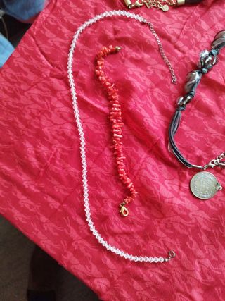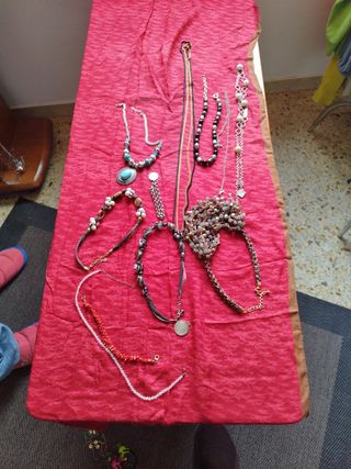 Conjunto de restos de bisutería con diferentes estilos y materiales. - Collares con cuentas y detalles metálicos. - Pulseras con adornos. - Piezas con piedras y abalorios.
