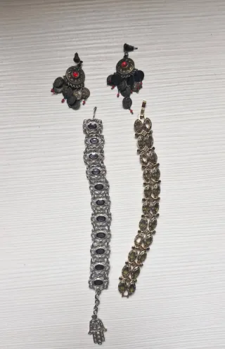 Conjunto de bisutería que incluye pendientes y 2 pulseras. - Pendientes con detalles de monedas y abalorios rojos. - Pulsera plateada con piedras moradas y amuleto de mano. - Pulsera dorada con piedras verdes y detalles. - Diseño étnico y llamativo.