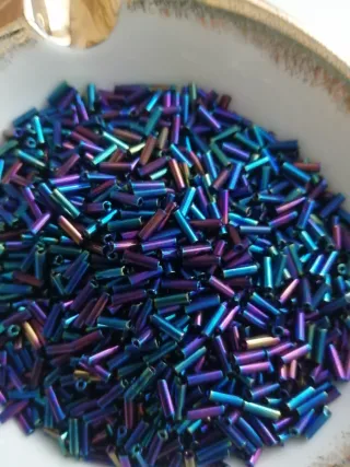 Lote de abalorios tipo canutillo con un acabado iridiscente que combina tonos azules y morados. Grises. Rocalla redondas azul cobalto e irisadas, las más pequeñas grises oscuras. Ideal para bisutería, manualidades o costura. Forma cilíndrica. Acabado brillante. Grupo de colgantes con formas irregulares tono nácar.