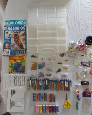 Gran lote de abalorios y materiales para crear tus propias joyas y bisutería. - Más de 50 tipos de cuentas y adornos. - Incluye revistas de manualidades y patrones. - Contiene tijeras, nylon de diferentes grosores y tipos. - Caja incluida para guardar todo. - Se puede vender por separado.