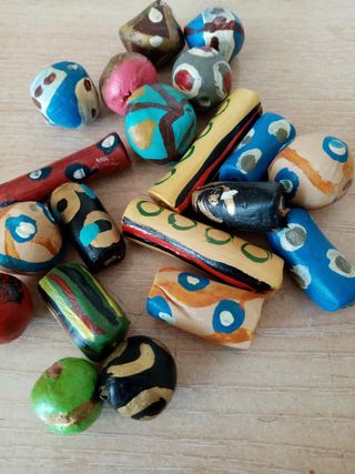 100 gr de cuentas africanas hechas a mano con diseños variados y coloridos. - Acabados pintados a mano. - Agujero para ensartar. Por jubilación vendo todos los abalorios que tengo. Puedes hacer lotes para abaratar los gastos de envío y por la compra de dos artículos de abalorios otro de regalo. Visita mi perfil para ver todos mis artículos