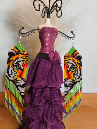 Pendientes largos y llamativos con diseño de tigre. - Hechos a mano con abalorios. - Diseño de cabeza de tigre. - Flecos de abalorios multicolores. - Gancho de anzuelo de rodio plata hipoalergénico.