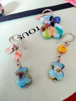 Conjunto de joyería Tous con detalles en Murano y plata.los pendientes están perfectos pero el colgante se me cayó y le falta un trocito,por eso precio de oferta, no se nota mucho mirar foto. - Piezas con abalorios de cristal Murano. - Enganches y detalles en plata. - Diseño colorido y único.