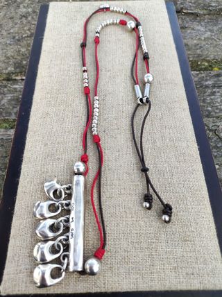 Collar largo ajustable de la marca española Uno de 50 con cordones de hilo en marrón y rojo y abalorios de metal bañado en plata. Envío en bolsita de organza a cargo del comprador. No se admiten devoluciones. #Ajarbe