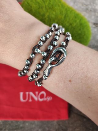 Versátil pulsera/collar de la marca española Uno de 50 como pulsera da tres vueltas con abalorios de metal bañado en plata y cordón de cuero. Envío en bolsita de organza a cargo del comprador. No se admiten devoluciones.