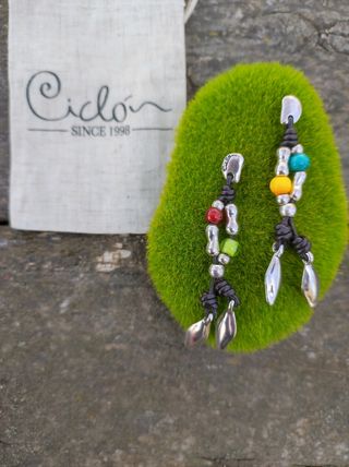 Pendientes largos de la marca española Ciclón de abalorios de metal bañado en plata y otros de resina de vivos colores. Envío en cajita a cargo del comprador. No se admiten devoluciones.