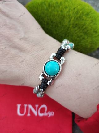 Pulsera de la marca española Uno de 50 modelo Flashy con abalorios de cristal y metal bañado en plata con pieza redonda central de color turquesa y cierre de botón, tiene en la parte de atrás unos puntitos oscuros sin daño que puedes ver en la última foto. Talla S, para muñeca de hasta 16cms. Envío en bolsita de organza a cargo del comprador. No se admiten devoluciones.