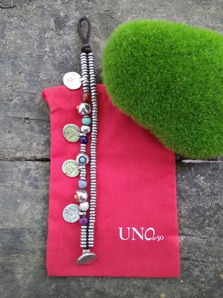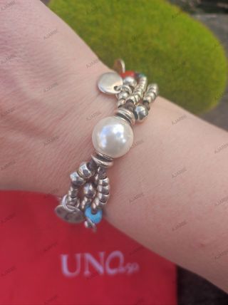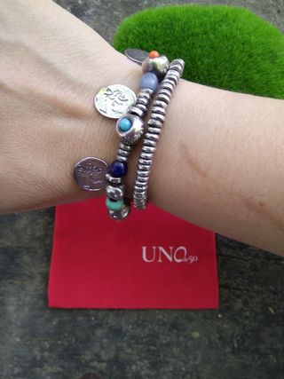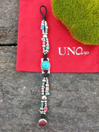 Pulsera de la marca española Uno de 50 de metal bañado en plata con abalorios colgantes y resinas de colores. Talla M, para muñeca de hasta 17cms. Envío en bolsita de organza a cargo del comprador. No se admiten devoluciones. #Ajarbe