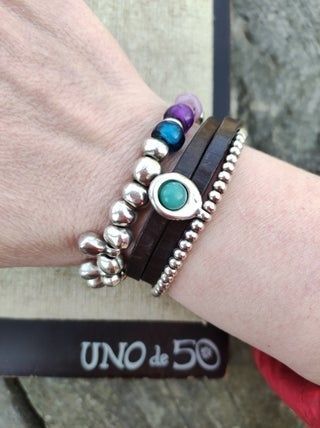 Pulsera de la marca española Uno de 50 modelo Cielo y Tierra de cuero, abalorios de metal bañado en plata y otros de resina de colores con cierre de botón. Talla S, para muñeca de hasta 16cms. Envío en bolsita de organza a cargo del comprador. No se admiten devoluciones.