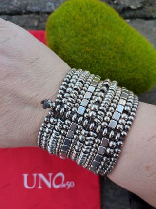 Pulsera de la marca española Uno de 50 de abalorios de metal bañado en plata con cierre de botón. Talla S, para muñeca de hasta 15'5cms. Envío en bolsita de organza a cargo del comprador. No se admiten devoluciones.