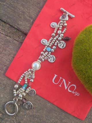 Pulsera de la marca española Uno de 50 modelo vintage con abalorios de metal bañado en plata y cierre de palito. Talla S, para muñeca de hasta 16'5cms. Al palito le falta baño de plata en los extremos, de ahí su precio, ver última foto! Envío en bolsita de organza a cargo del comprador. No se admiten devoluciones.