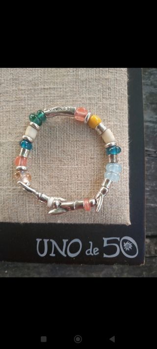 Pulsera elástica de la marca española Uno de 50 de abalorios de cristal de colores y otros de metal bañado en plata, algunos con forma de cola de pez. Talla única, para muñeca de hasta 16cms. Envío en bolsita de organza a cargo del comprador. No se admiten devoluciones.