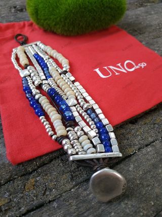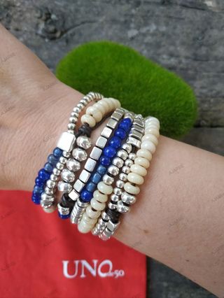 Pulsera finita de la marca española Uno de 50 de cuero con abalorios de cristal en azul, blanco y metal bañado en plata con cierre de botón. Talla S, para muñeca de hasta 16cms. Envío en bolsita de organza a cargo del comprador. No se admiten devoluciones.