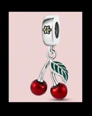 Este encantador charm presenta un diseño de dos cerezas rojas brillantes, unidas por un tallo y acompañadas de una hoja verde. El colgante se completa con un detalle de una pequeña flor plateada con un centro amarillo en la parte superior. S925 - Diseño de cerezas con hoja. - Detalle de flor plateada con centro amarillo. Dije abalorio