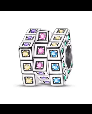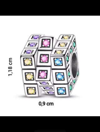 Charm con diseño de cubo de Rubik, adornado con pequeñas gemas de colores. S925 NO GIRA - Diseño tridimensional. - Acabado metálico plateado. Dije abalorio