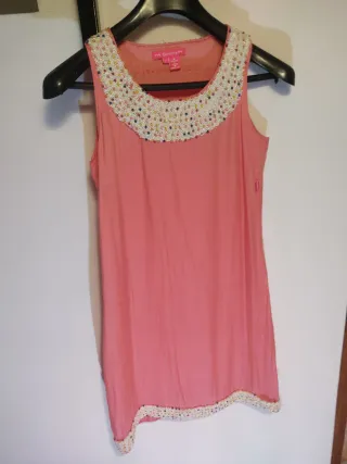 Vestido sin mangas en color rosa, con un detalle de abalorios en el cuello y el bajo. - Cuello redondo adornado con abalorios multicolores. - Bajo con detalle de abalorios. - Diseño sin mangas.
