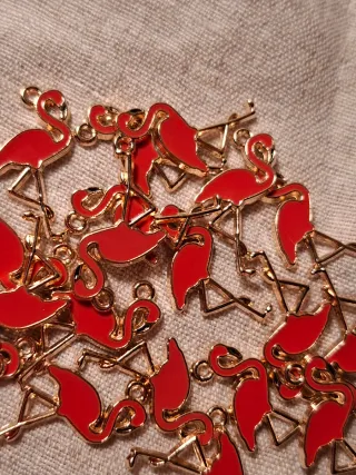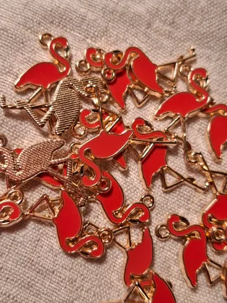 Lote de 10 abalorios con forma de flamenco, perfectos para manualidades y bisutería. - Diseño esmaltado en rojo y dorado. - Cada dije tiene un asa para colgar.