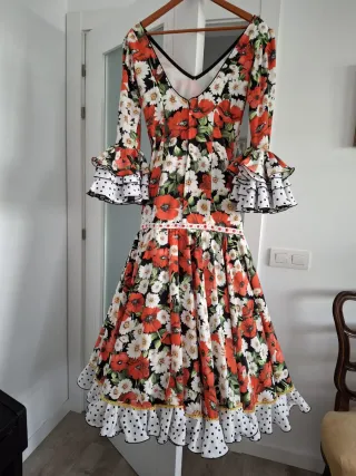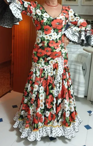 Traje de flamenca de la marca Sibilina, con una sola puesta. - Diseño elegante y cómodo. - Mangas largas con transparencias y lunares. - Espalda descubierta con detalles de abalorios. - Volantes en cascada en la falda.