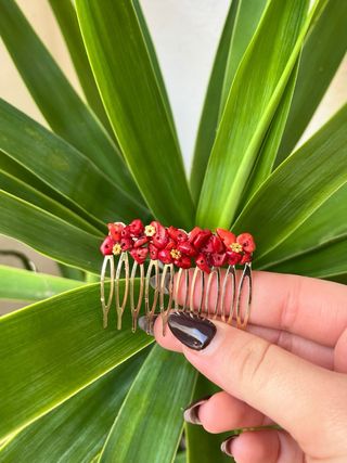 Elegante peineta flamenca adornada con piedras rojas y pequeños detalles dorados. - Diseño artesanal. - Base metálica dorada. - Abalorios de piedras rojo.