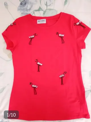 Original camiseta de manga corta con un divertido estampado de flamencos hecho con abalorios. Sienta muy bien. Talla L, XL, pero talla poco. Ver medidas en las fotos. - Diseño con abalorios. - Cuello redondo.