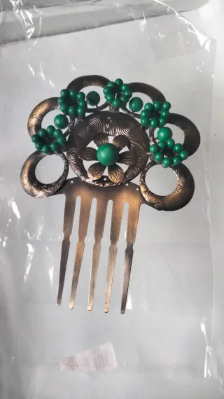 Preciosa peina de estilo flamenco, con un diseño intrincado y adornos. - Detalles en forma de flor y aros. - Abalorios verdes que aportan un toque de color. - Base metálica con dientes para sujetar el cabello.