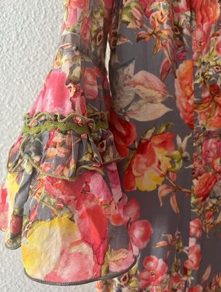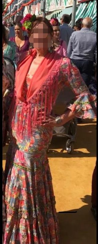 Traje de Flamenca,de Micaela Villa. Solo dos puestas. Rematado con terciopelo gris y piquillo verde,muy original. Muy cómodo y bonito para la Feria o el Rocío. Medidas: 96 - 84 - 100. No tiene para sacar de ancho, solo de largo. Regalo mantoncillo y abalorios