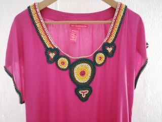 VESTIDO TIPO TUNICA CORTO. COLOR ROSA FUCSIA. CON PEQUEÑAS BOLAS DE COLORES EN EL ESCOTE QUE FORMAN UN DIBUJO. SOLO SE HA USADO EN 1 OCASION.