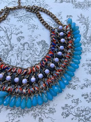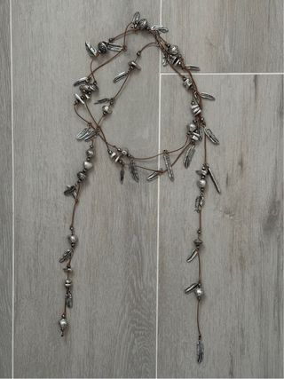 Elegante collar largo con un diseño llamativo y lleno de detalles. - Adornado con una variedad de abalorios y cuentas. - Incorpora flecos metálicos que añaden movimiento. - Cadena ajustable para un ajuste personalizado.