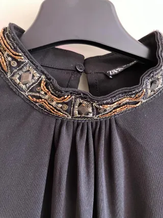 Elegante vestido negro de Zara con detalles de pedrería en el cuello. - Cuello con pedrería. - Diseño sin mangas. - Cintura elástica. parte superior viscosa e inferior punto. Faltan dos abalorios cuello como se ve en fotos.