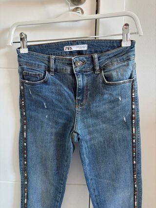 Vaqueros de Zara. Talla 34. Con detalles de abalorios en los laterales. Bajo deshilachado.