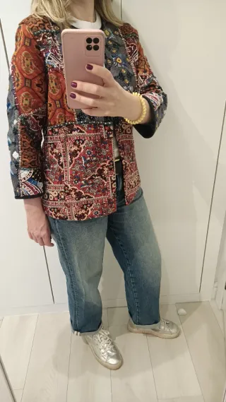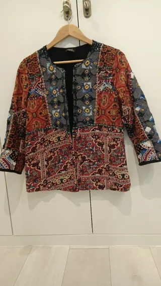 Elegante blazer de Zara con estampado patchwork - Detalles de pedrería y bordados. - Corte recto y manga larga Forro interior. Usada sólo una vez