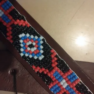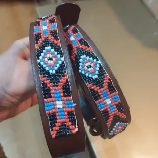 Cinturón de cuero con diseño de abalorios. - Abalorios de colores: rojo, azul, blanco y negro. - Detalle de patrón geométrico. - Hebilla metálica. Talla M Sin estrenar