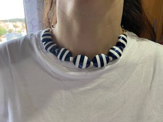 Collar chocker con abalorios en plástico blancos con rayas azul marino, engarzadas con lazo de seda blanco Lleva una cadena y cierre de seguridad para ajustar la longitud al abrocharlo en el cuello Está nuevo sin estrenar y muy bien conservado!