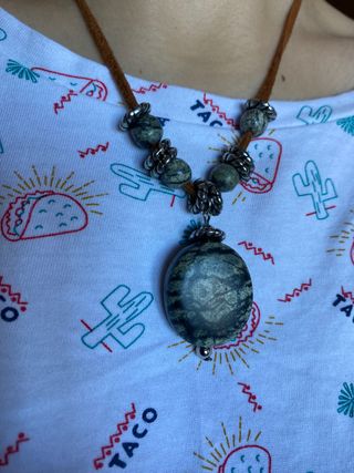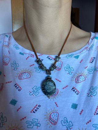 Collar montado en cordón de cuero con una piedra Preciosa, la crisolita, y abalorios en plata. Se ajusta el largo con una cadena de plata y cierre de mosquetón de seguridad. Está nuevo sin estrenar y en perfecto estado de conservación! Queda muy bonito puesto y es muy ligero, apenas pesa!