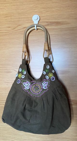 Bolso de mano verde pistacho bordado con hilos de colores (verde, amarillo) abalorios (blanco, amarillo, rosa) y conchas de nácar Lleva dos asas de madera, que soportan peso muy bien. Marca: Bershka Material: Lona exterior e interior de tela de hilo. Medidas: 29 cm alto, 39 cm largo y 8,5 cm de ancho. ( ver foto para ver la referencia de las medidas). Bolso de mucha capacidad!!! Está nuevo, muy poco uso, y muy bien conservado!