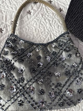 Conjunto de dos bolsos de mano, perfectos para eventos especiales. - Un bolso negro con textura plisada y cierre de solapa. - Un bolso plateado adornado con abalorios y lentejuelas.