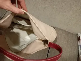 Bolso original de piel de Purificación García, se puede visitar, costó 360€ - Diseño bicolor en beige y rojo. - Asa de mano. - Cremallera decorativa con detalle de flecos y abalorios.